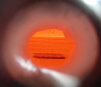 Jack removing work from a kiln in the studio, and pictures through the peephole with the kiln at full firing temperature.